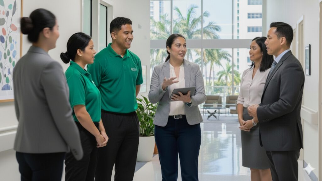 Whether you oversee a regional HQ in West Palm Beach or manage multiple buildings across South Florida, we deliver consistent, quiet results that help your business move forward without friction. From spotless floors to sanitized meeting spaces, we clean for health, efficiency, and peace of mind.